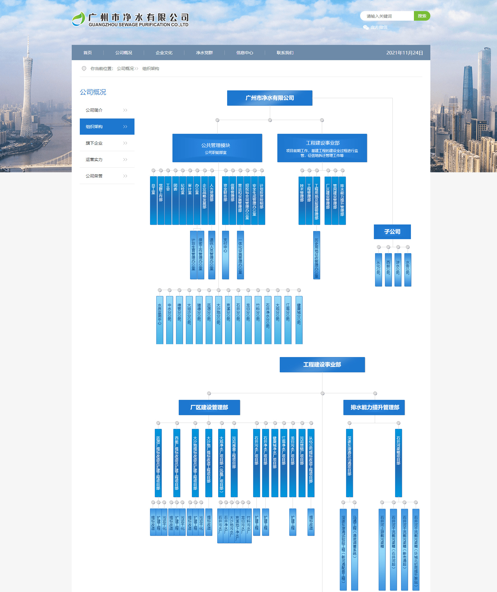 廣州市凈水有限公司是廣州市水務(wù)投資集團(tuán)有限公司的全資子公司,創(chuàng)建于1989年,發(fā)展至今已成為一家集污水處理、建設(shè)、運(yùn)營(yíng)、資產(chǎn)經(jīng)營(yíng)及研發(fā)為一體的特大型國(guó)有污水處理企業(yè)。