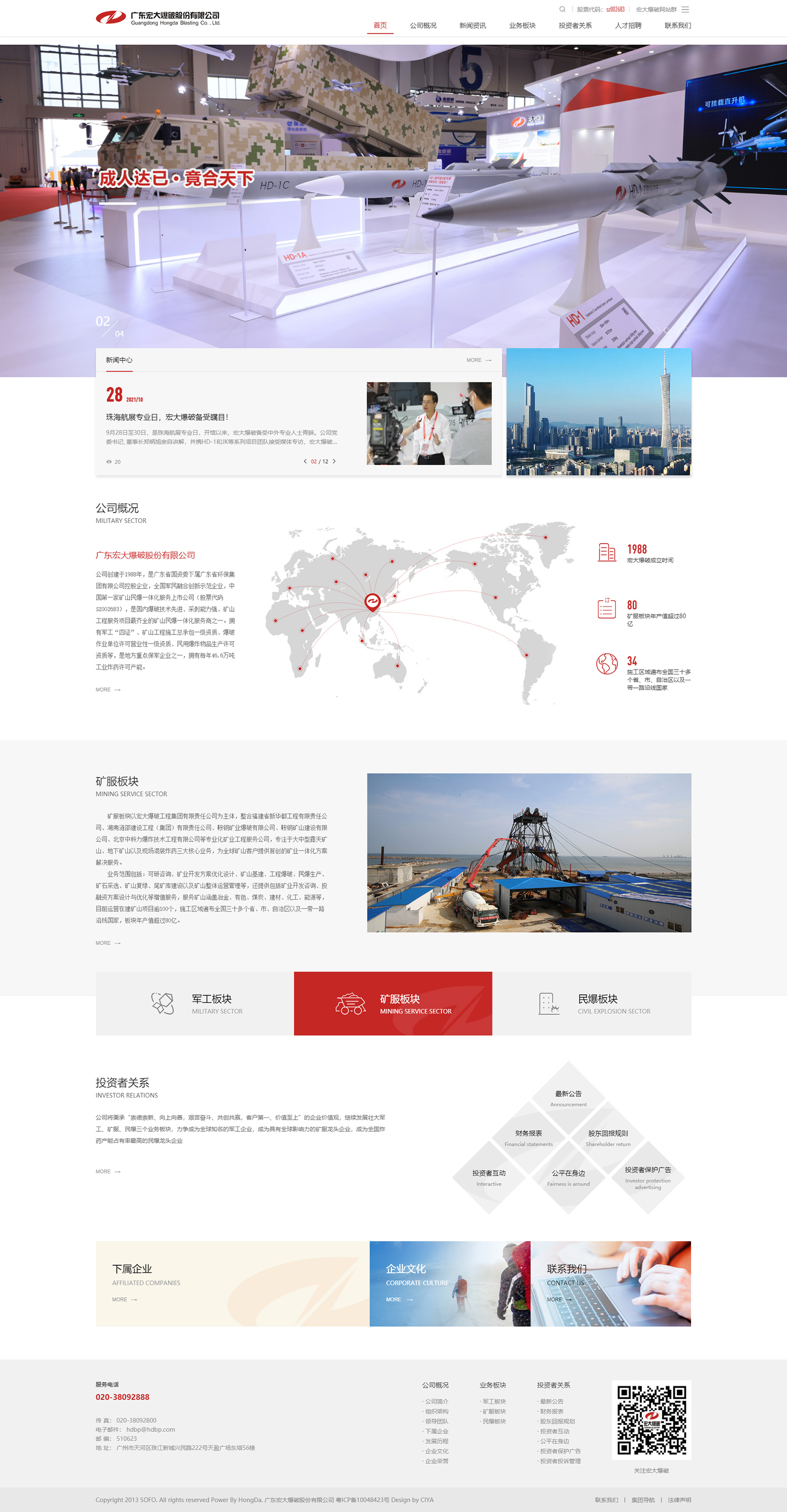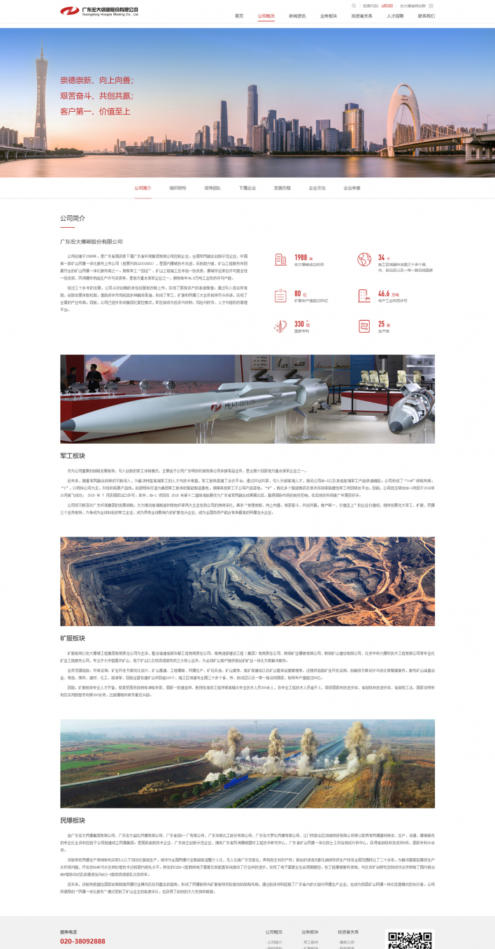 公司創(chuàng)建于1988年,是廣東省國(guó)資委下屬?gòu)V東省環(huán)保集團(tuán)有限公司控股企業(yè),全國(guó)軍民融合創(chuàng)新示范企業(yè),中國(guó)第一家礦山民爆一體化服務(wù)上市公司(股票代碼SZ002683),是國(guó)內(nèi)爆破技術(shù)先進(jìn)、采剝能力強(qiáng)、礦山工程服務(wù)項(xiàng)目最齊全的礦山民爆一體化服務(wù)商之一。擁有軍工“四證”、礦山工程施工總承包一級(jí)資質(zhì)、爆破作業(yè)單位許可營(yíng)業(yè)性一級(jí)資質(zhì)、民用爆炸物品生產(chǎn)許可資質(zhì)等,是地方重點(diǎn)保軍企業(yè)之一,擁有每年46.6萬(wàn)噸工業(yè)炸藥許可產(chǎn)能。