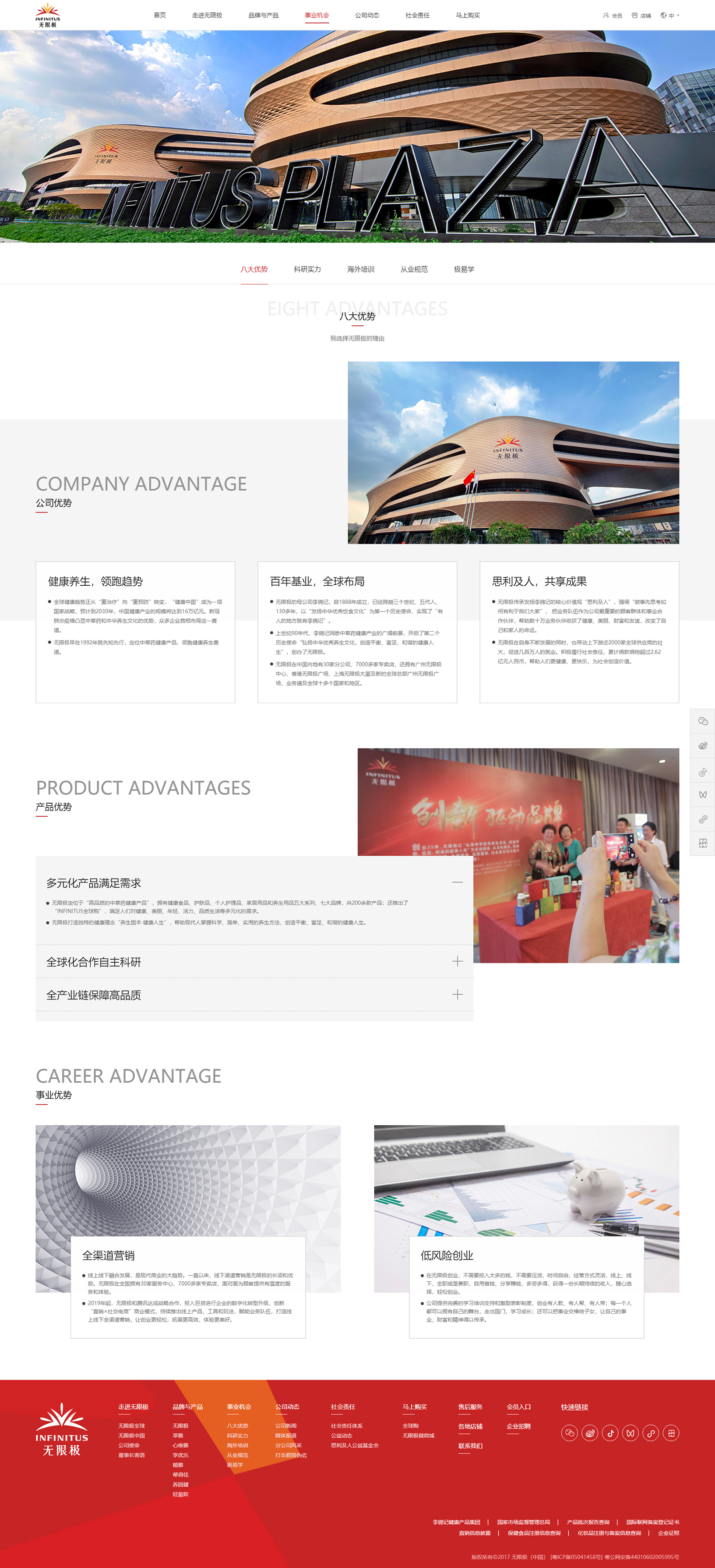 無限極努力打造產(chǎn)品、品牌、核心技術(shù)和平臺建設(shè)等方面的競爭優(yōu)勢,擁有新會、營口兩個生產(chǎn)基地,香港無限極廣場、廣州無限極中心、上海無限極大廈和廣州無限極廣場(在建)等物業(yè),在中國內(nèi)地設(shè)有30家分公司、30家服務(wù)中心和超過7000家專賣店。